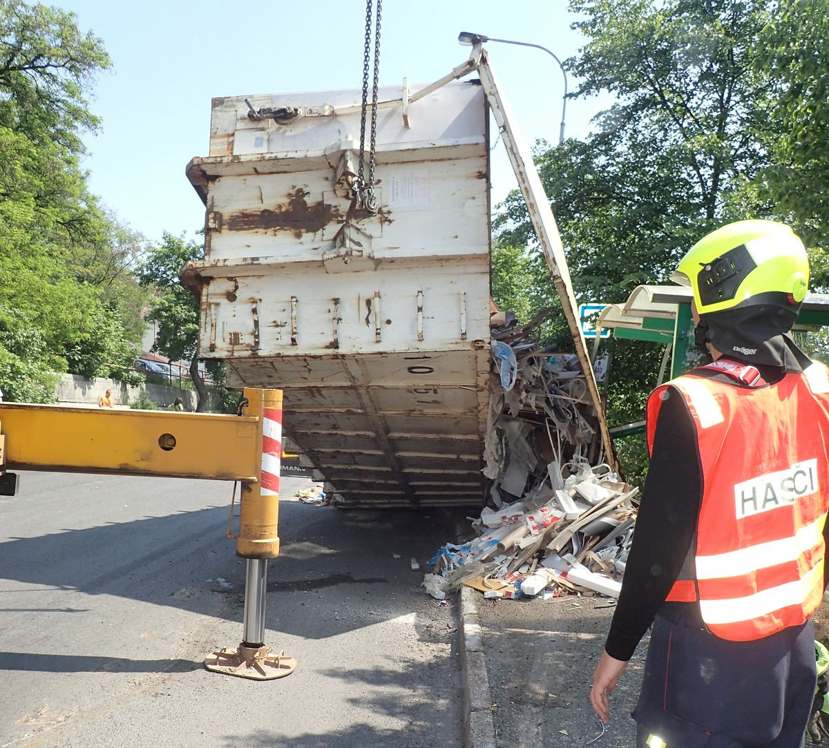Přivolaní hasiči ihned po příjezdu prozkoumali místo nehody, řidič nákladního auta totiž nedokázal stoprocentně říct, jestli v době nehody na zástávce někdo byl. Aby se hasiči ujistili, že pod kontejnerem opravdu nikdo nezůstal, pomáhal s vyzvedáváním jeřáb.